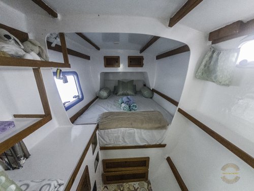Spacious indoor/outdoor dining for up to 5 guests, with generous lounging areas and a seamless connection to the ocean. Solar-powered systems, desalination, and full amenities ensure comfort without compromise.