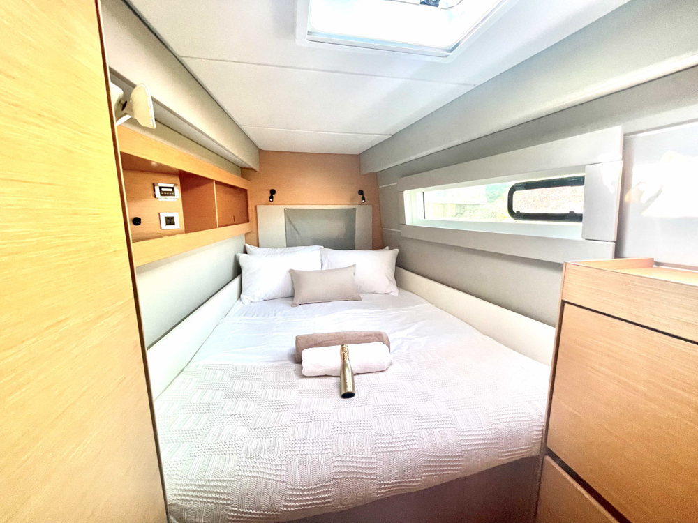 The open-plan cockpit seamlessly connects to the salon and galley through two large sliding doors, creating a spacious and airy feel for effortless entertaining and relaxation. This seamless flow between indoor and outdoor living allows you to enjoy the breathtaking Fijian scenery and balmy breezes from the comfort of the expansive salon or the plush seating areas on deck.