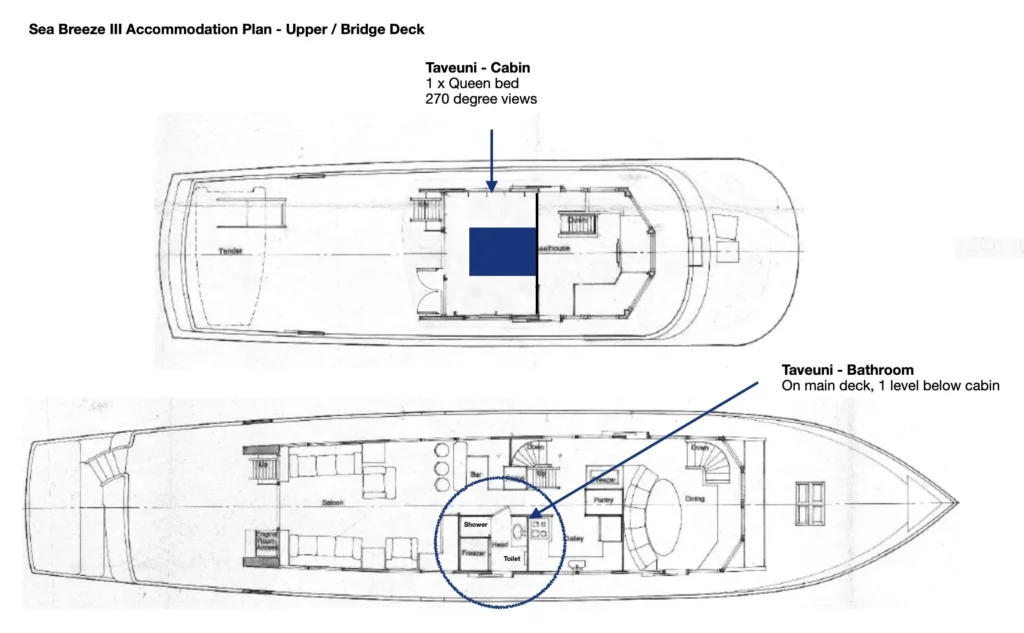 Waikawa and Taveuni can be booked as private single cabins. A two guest cost is payable.